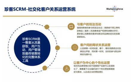 以珍客SCRM为例。针对获客难、留客难、内容生产难、转化成本高等问题,珍客SCRM基于“MA营销自动化+企微+CDP客户数字中心”的完整应用架构,打造了“CMSDO”数字化客户资产赋能技术模型,应用“Con-Tech”+“Mar-Tech”+“Sales-Tech”+“Data-Tech”+“Op-Tech”五大技术能力,帮助企业实现“内容自动制作、智能推广、全渠道获客引流至私域、企微连通销售资源促进交易转化、强大数据分析和运营能力赋能数据资产价值、同频客户全生命周期管理、再营销和传播裂变”等不同阶段的营销诉求,可以为不同行业及场景持续输出差异化、全方位的私域客户资产运营解决方案。
