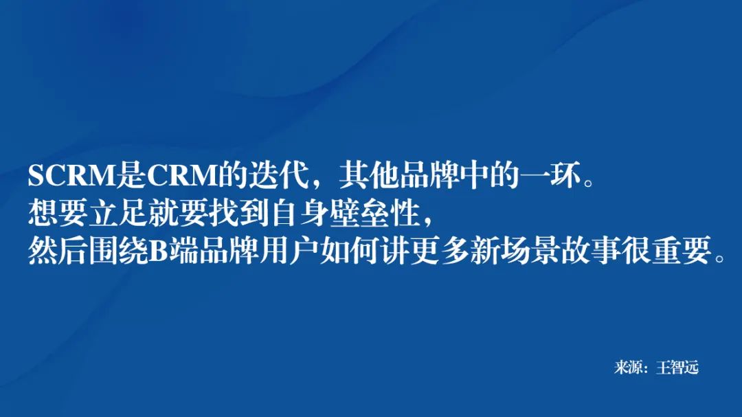 这样看来,SCRM是CRM的迭代,市场拥有社交需求外的升级品;那它属于其他生态中的一环,想要立足就要找到自身壁垒性,然后围绕B端品牌用户如何讲更多新场景故事很重要。
