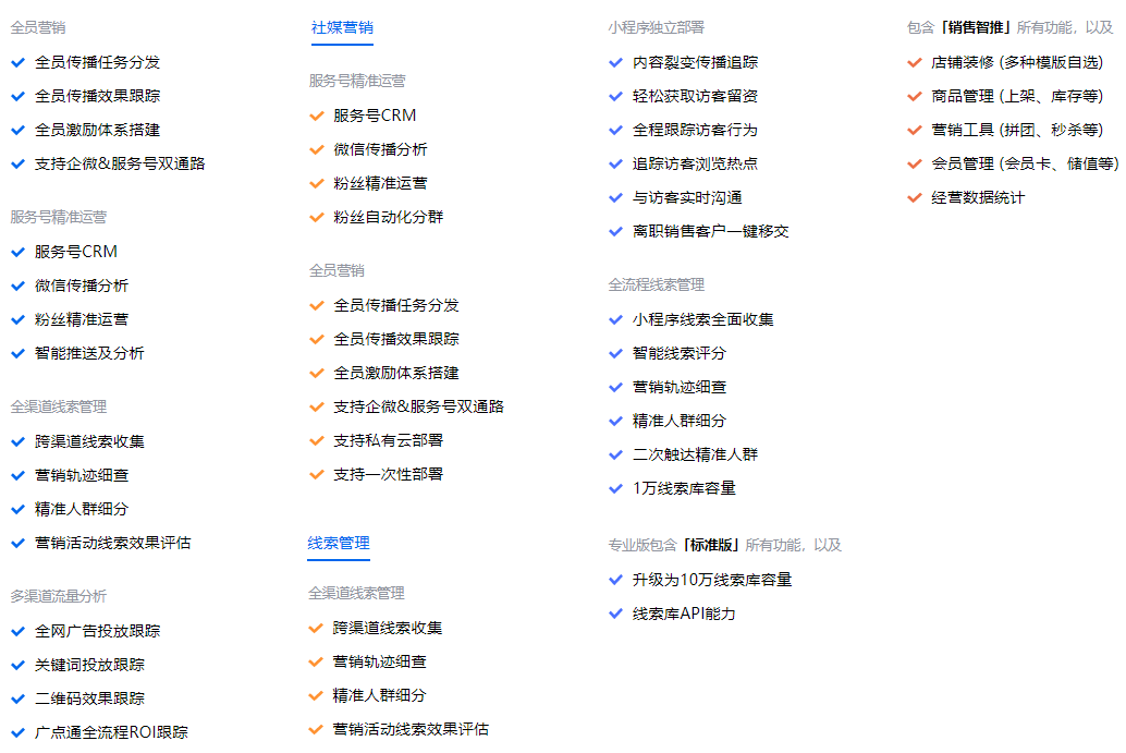以腾讯官方旗下的企业SaaS服务腾讯企点SCRM为例,我们可以清晰地对比出不同购买方案的价格和功能,其中适合中小型企业的标准版功能丰富,起售价需6888元/年。(详见下图)