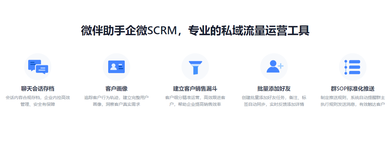 微伴助手是一款安全免费的SCRM管理系统,基于企业微信开放的接口,已合规开发60余项高级营销功能,适用于引流获客、客户意向跟进、销售转化、社群运营等全方位营销场景。目前已经为电商、教育、金融、保险、医疗等机构提供技术支持。