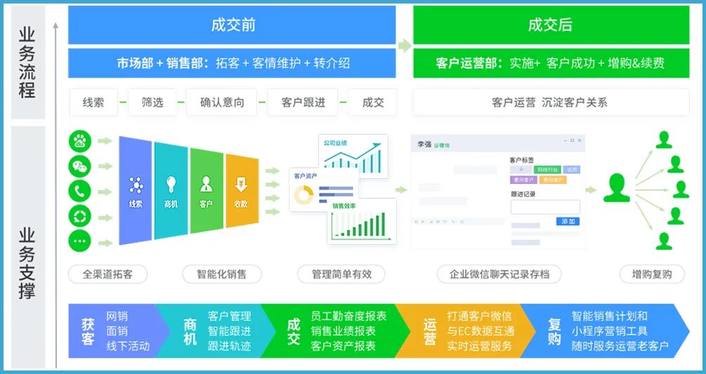譬如:从售后角度站在CRM视角如何维护老客户关系,从老客户信息裂变带来新线索,对新意向跟踪到转化,这些全链路都基于SCRM。