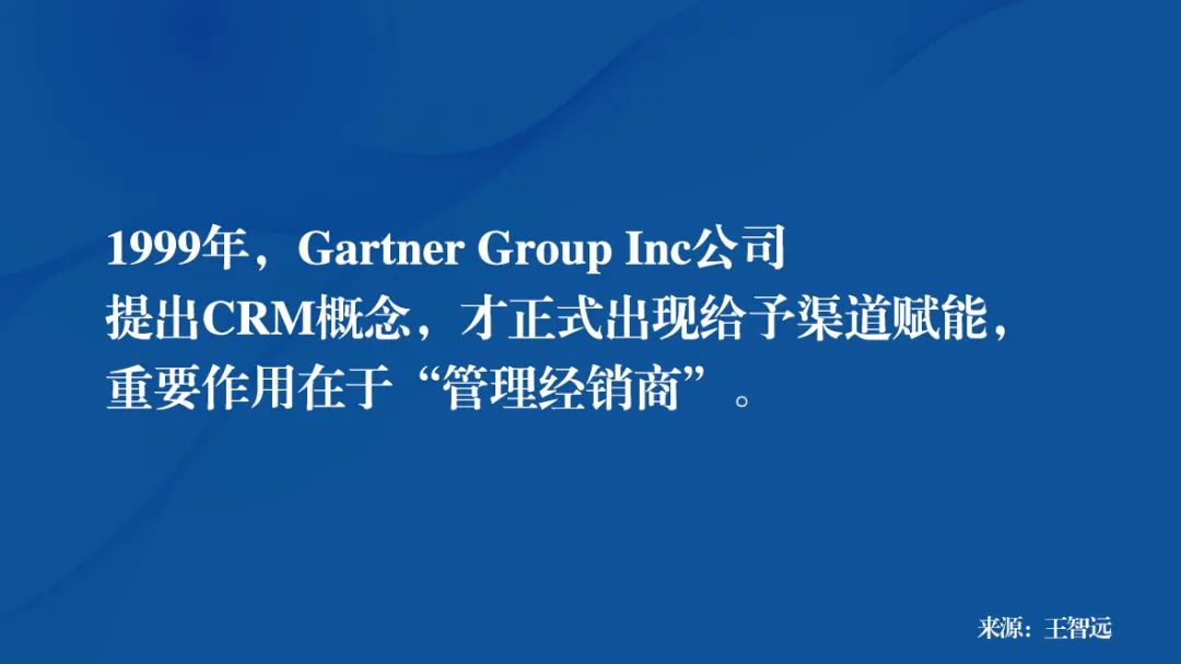 直到1999年随之技术出现大变革,Gartner Group Inc公司提出CRM概念,才正式出现给予渠道赋能,重要作用在于“管理经销商”,这也造就第一轮数字化变革。